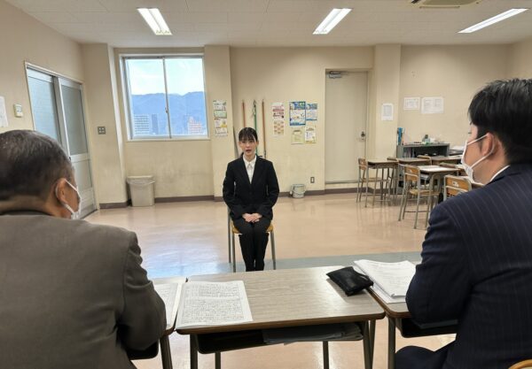 1日目は校内外の講師による講和と履歴書用の写真撮影、2日目は本校教職員が面接官となって2対1の模擬面接が行われ、学生の皆さんも真剣な表情で面接に臨んでいました。