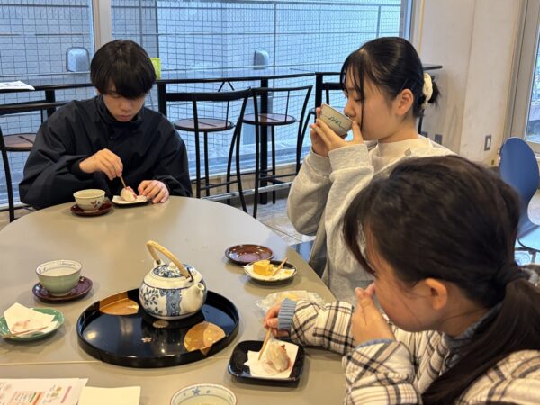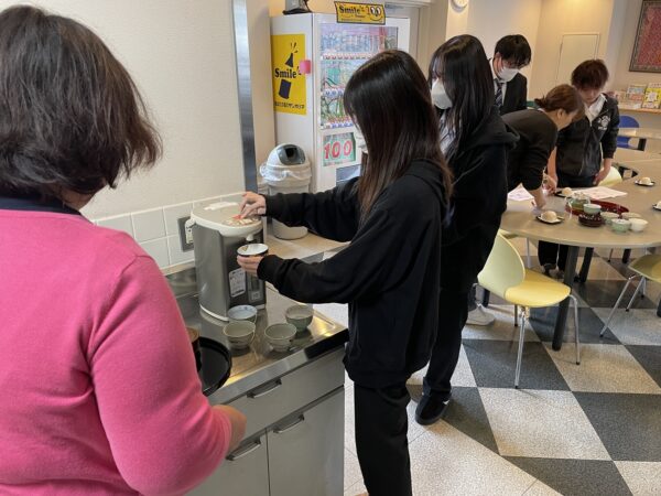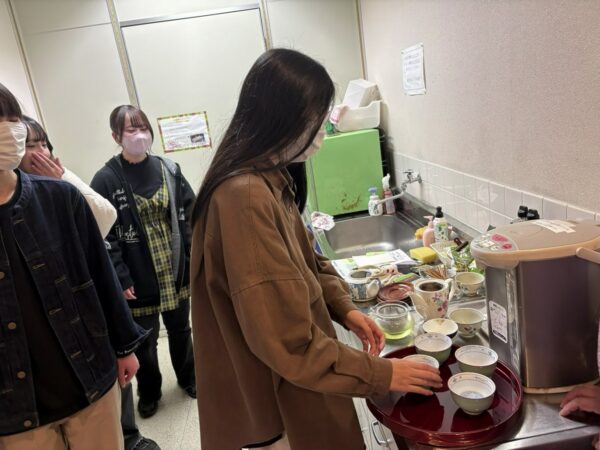 ビジネス実務の今年度最後の授業は、来客への「お茶出し実習」。